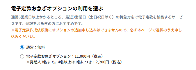会社設立登記をお急ぎの方は「電子定款お急ぎオプション」をご利用ください。