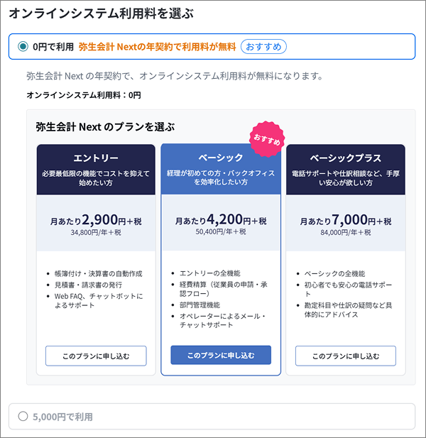 弥生会計 Next を年契約いただくと、オンラインシステム利用料が無料になります。