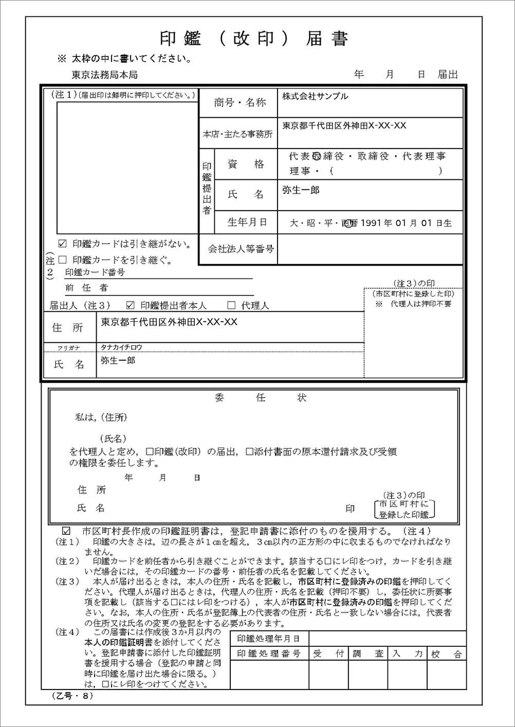 法務局で会社実印を印鑑登録する際は、『印鑑(改印)届書』を作成のうえ提出します。