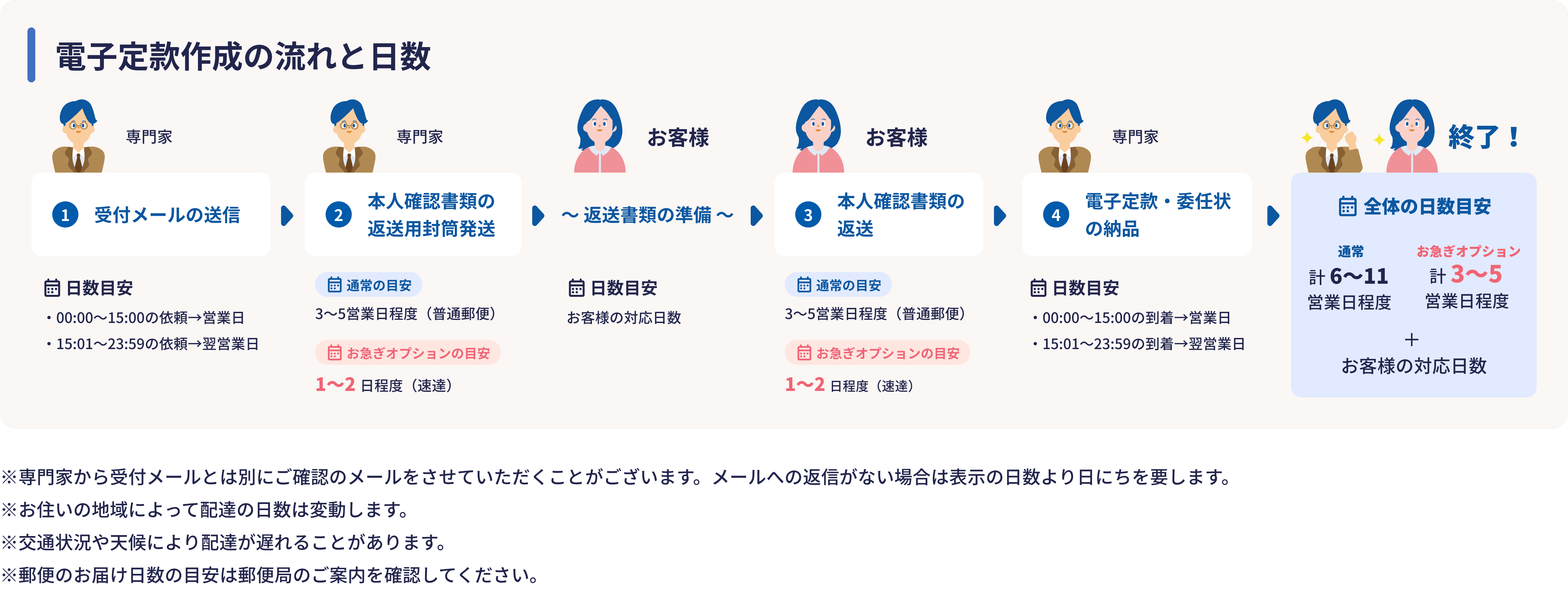 ※電子定款お急ぎオプションをご利用の場合は、15時までのお申込みでお申込み当日(土・日・祝日を除く)に速達にて本人確認書類の返送用封筒を発送します。15時以降の場合は翌営業日に発送いたします。