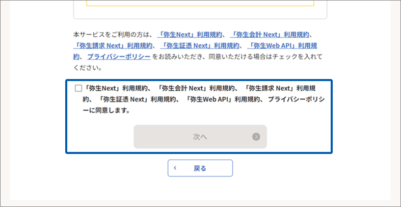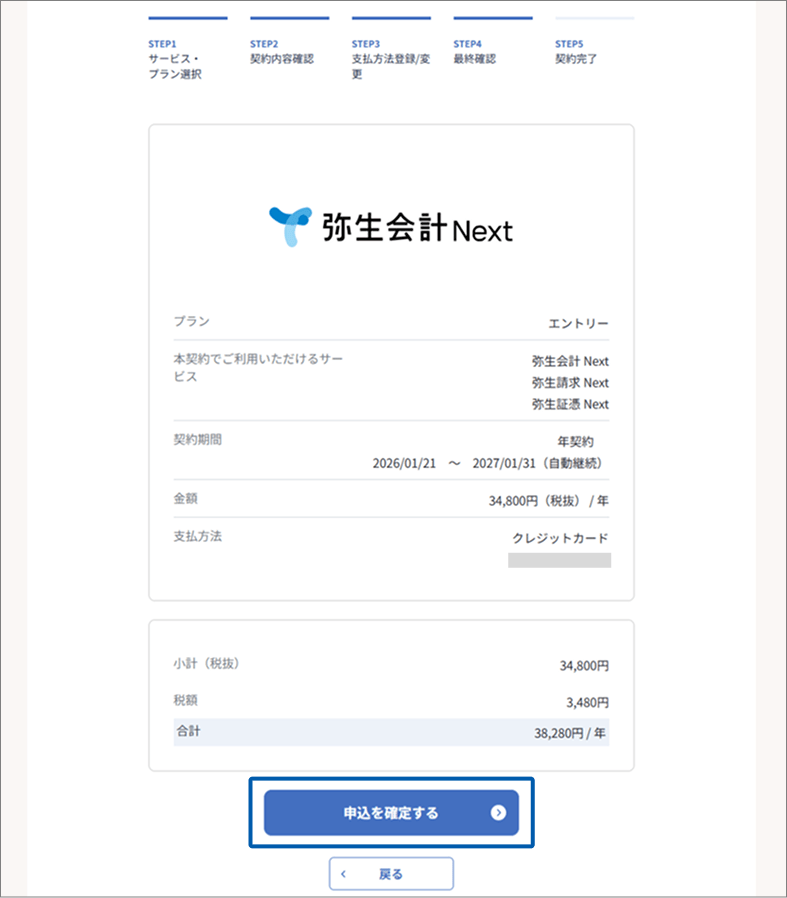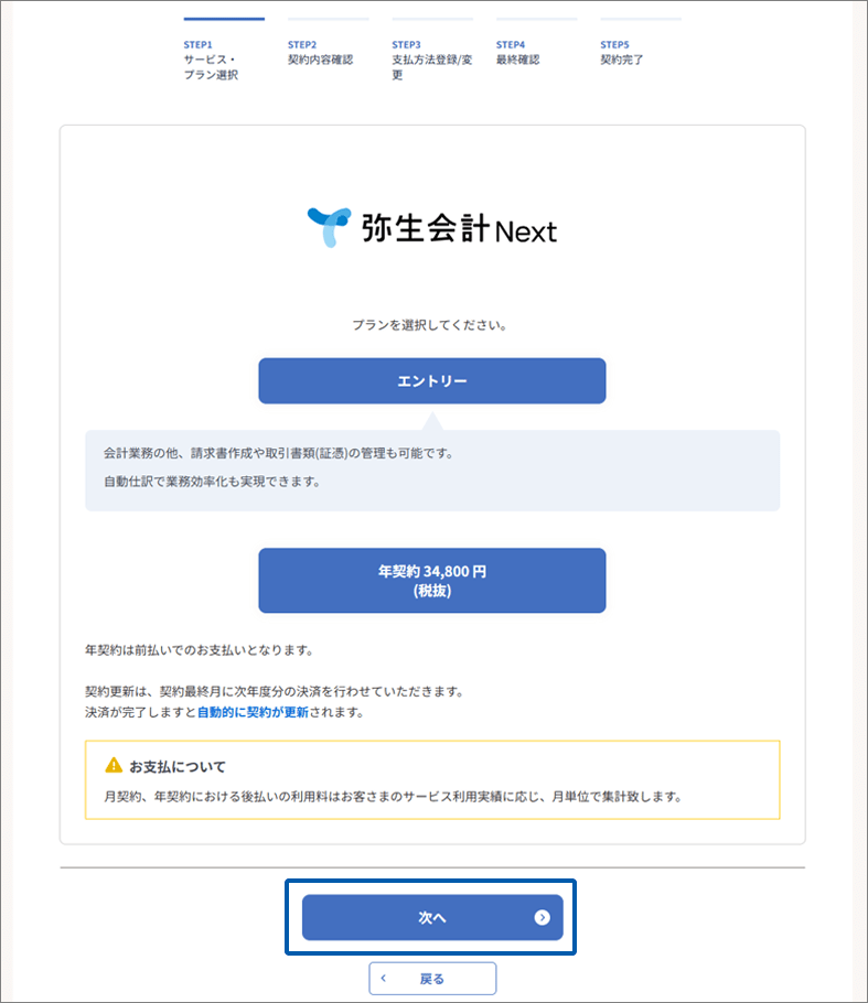 STEP1-12(合同会社の場合はSTEP1-10)で、契約する弥生会計 Nextのプランを選択します。選択後、別ウインドウで契約の画面が表示されます。