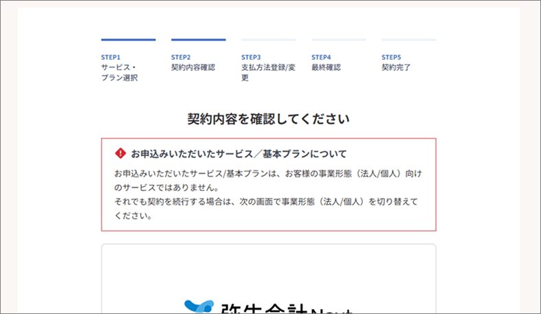 「Misoca」や「やよいの青色申告 オンライン」などで個人事業主として登録している弥生IDで「弥生のかんたん会社設立」をご利用の場合、弥生会計 Nextの契約を行う際に契約内容で事業形態の変更の表示がされます。