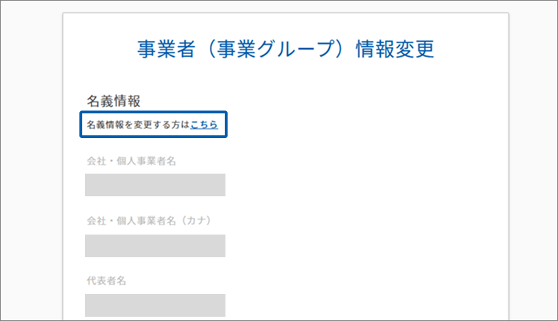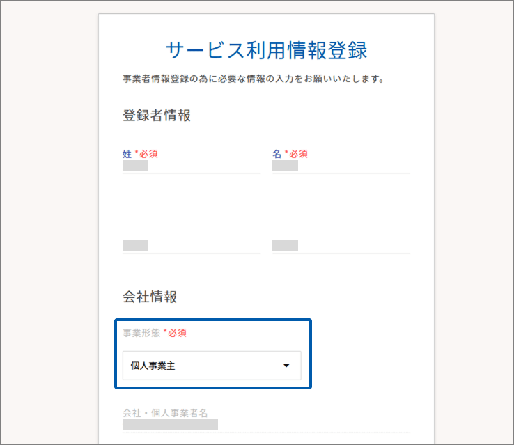 事業形態を「個人事業主」から「法人」に変更します。会社・個人事業者名等は以下ページから変更をできません。情報を変更したい場合は、「2.事業者情報の変更手順」からご確認ください。