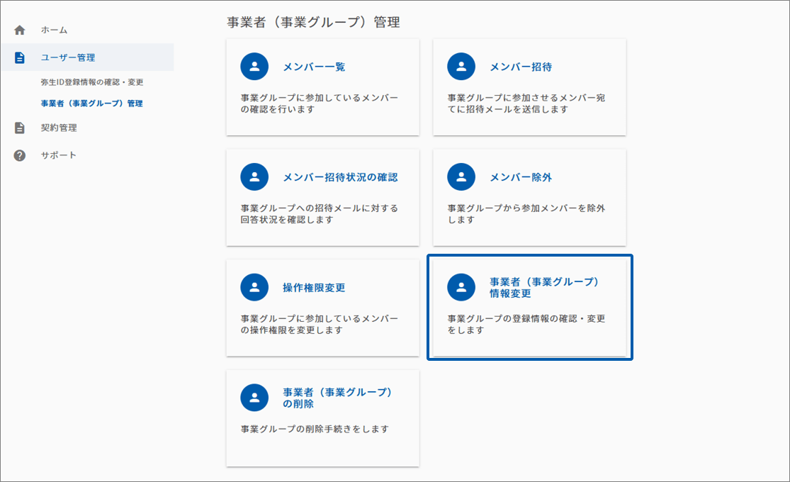 マイポータルにログインし、左上の「ユーザー管理」から「事業者(事業グループ)管理」を選択します。