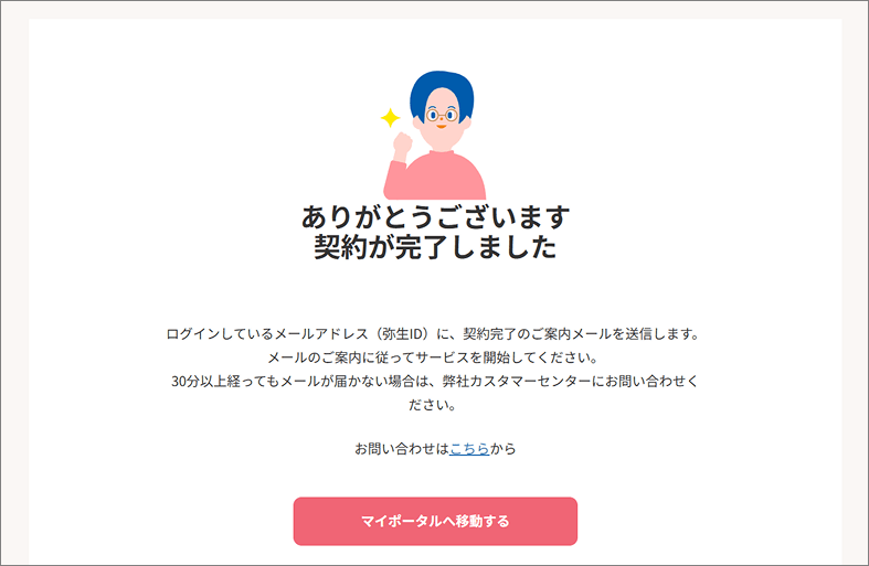 以下の画面が表示されれば、契約完了です。「マイポータルへ移動する」をクリックします。