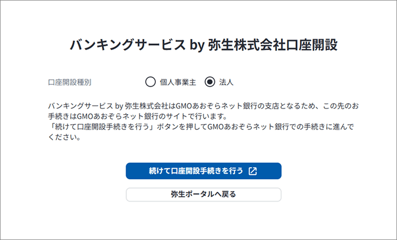 口座開設種別は「法人」を選択し、「続けて口座開設手続き」を選択します。以降はGMOあおぞらネット銀行の画面にて手続きを進めます。