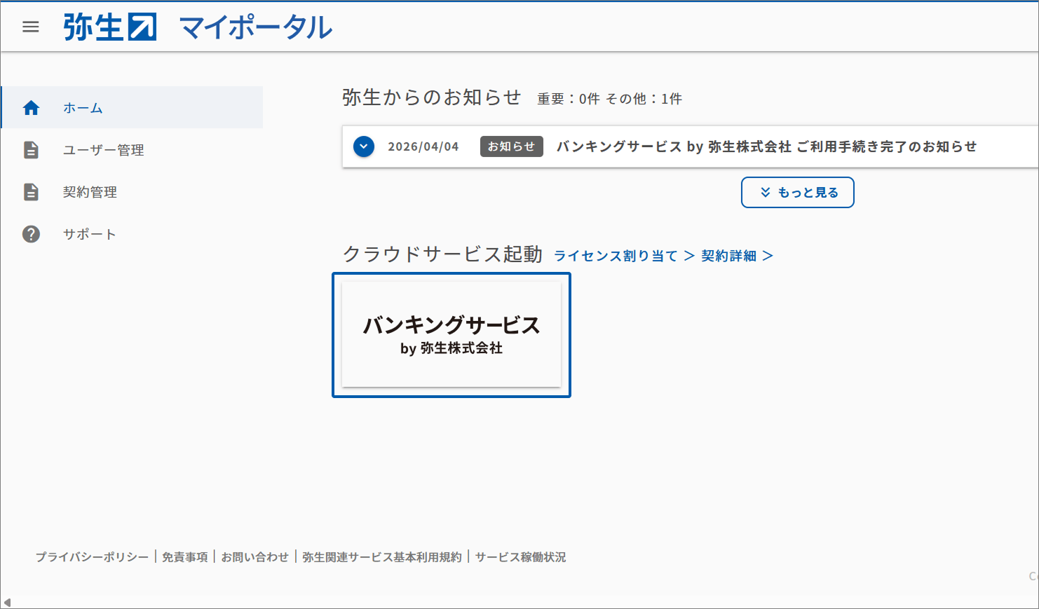 マイポータルの「クラウドサービス起動」から「バンキングサービス by 弥生株式」をクリックします。