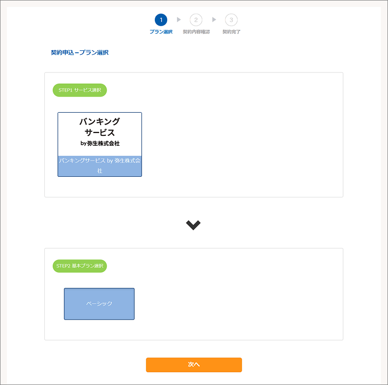 プラン選択画面にて、「バンキングサービス by 弥生株式」の「ベーシック」プランを選択し、「次へ」を選択。